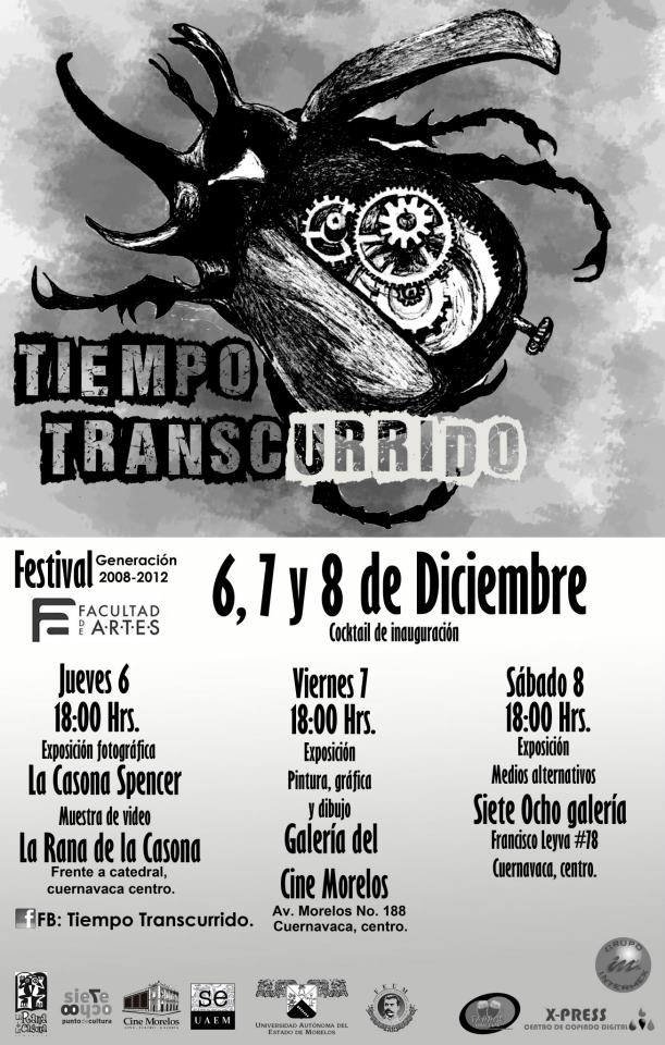 Que tal banda… Están cordialmente invitados al Festival de Arte, Tiempo Transcurrido, que se celebrará, el 6, 7 y 8 de Diciembre, como culminación de la generación 2008-2012 de La facultad de Artes UAEM en el que participaran galerias como La Casona Spencer, La Rana de la Casona, Galería del Cine Morelos y Sie7eocho galería.