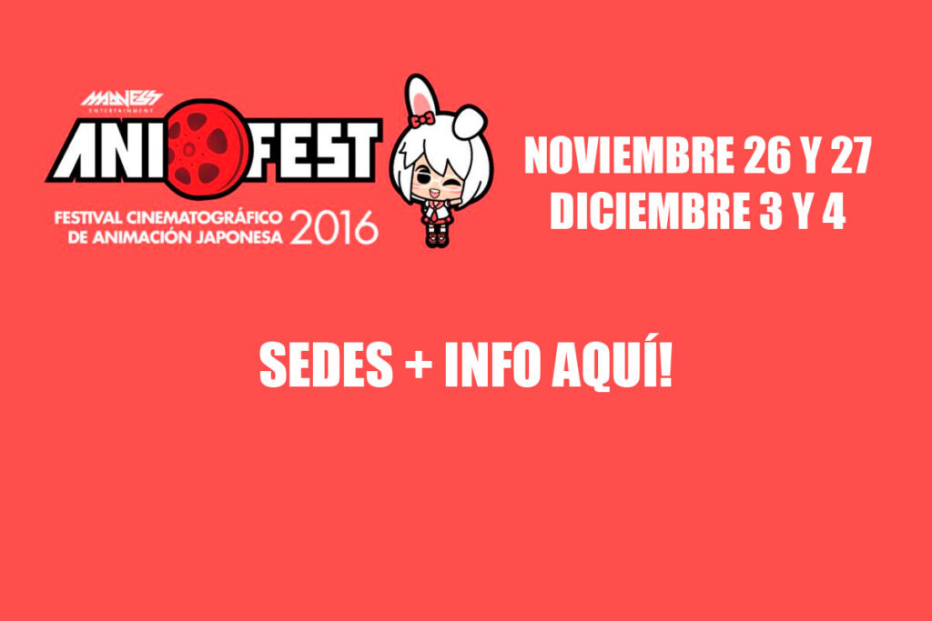 El festival ANIFEST 2016 se llevará a cabo en 4 fechas, repartidas en Noviembre y Diciembre, para que no tengas pretextos de no asistir. Las fechas son: 26 y 27 de Noviembre y 3 y 4 de Diciembre de 2016.
