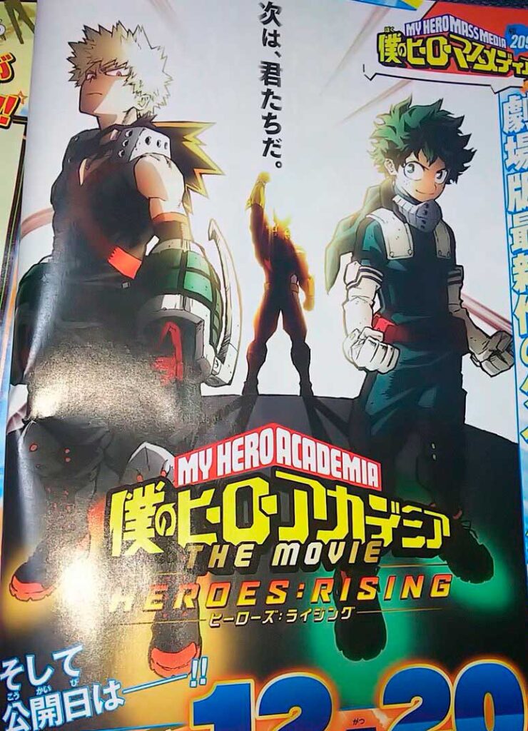 Hace unas horas se ha filtrado el título de la ya anunciada nueva película de Boku no Hero Academia, el cual será: «My Hero Academia – Heroes: Rising». Esta información viene de la Editorial Shueisha, en un scan de aja resolución con el poster de la película, indicando que será estrenada en cines nipones el 20 de diciembre de 2019.