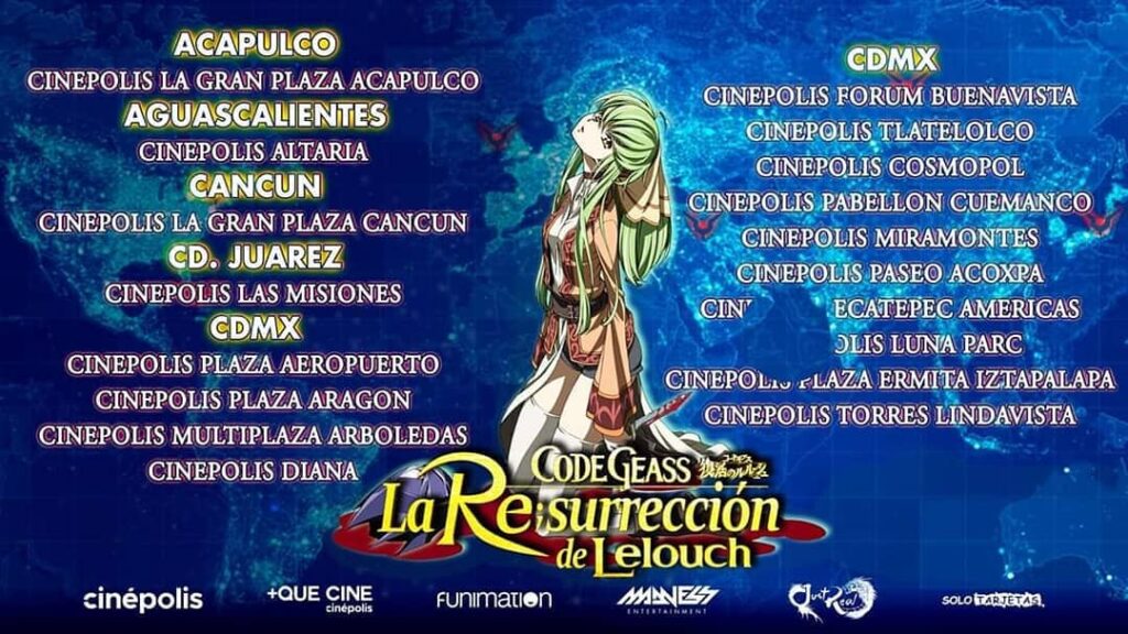 Hace unos días se ha dado a conocer la lista de cines en los que estará disponible la película «CODE GEASS: La Resurrección de Lelouch», en su estreno en cines mexicanos, recordándote que la cinta estará en exclusiva por la cadena de Cinepolis.