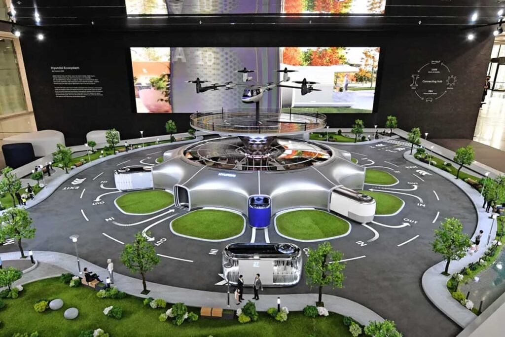 El modelo a escala 1: 8 en exhibición es una miniatura de la exhibición mostrada en CES 2020 e incluye la integración de sus soluciones de movilidad inteligente Urban Mobility (UAM), Purpose Built Vehicles (PBV) y Hub (Mobility Transit Base) como parte de un dinámico paisaje urbano futuro centrado en el ser humano.