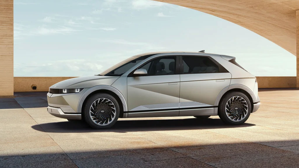 En los lados, las manijas de las puertas con descarga automática brindan un estilo de superficie limpio y una eficiencia aerodinámica mejorada. Las formas frontal y trasera del vehículo se fusionan en sus puertas, ofreciendo otro ejemplo del diseño de «Dinámica Paramétrica» de Hyundai, visto por primera vez en la totalmente nueva Tucson 2022. La fuerte forma del pilar C, inspirada en el concepto EV ’45’ de Hyundai, le da al IONIQ 5 una presencia dominante claramente identificable desde la distancia.