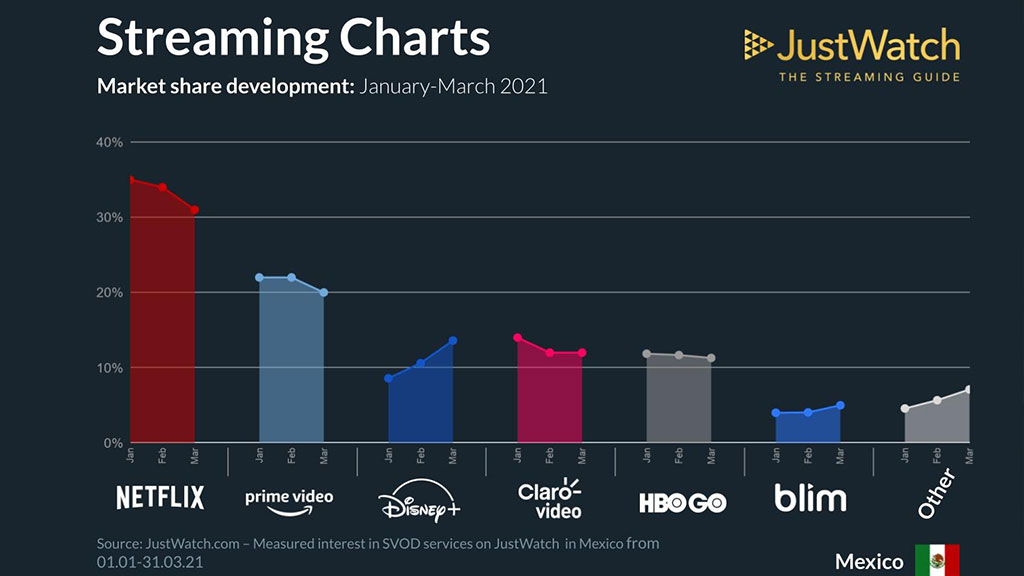En esta ocasión, te queremos mostrar unos datos muy buenos que nos han compartido los amigos de JustWatch, en donde podemos apreciar el porcentaje de mercado que tiene los servicios de streaming más populares en México, como son Netflix, Prime Video, Claro Video, Blim, Disney + y HBO Go, para el primer cuarto de este 2021