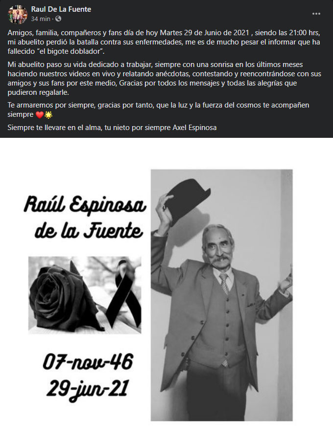 Hace algunas semanas, mediante su nieto Axel Espinosa, nos enteramos que se encontraba hospitalizado y requerían de apoyo económico para todos los gastos tan fuertes que conlleva una situación de esta magnitud, posteriormente Raúl fue dado de alta, pero lamentablemente como escribió su nieto, perdió la batalla contra todas sus enfermedades.