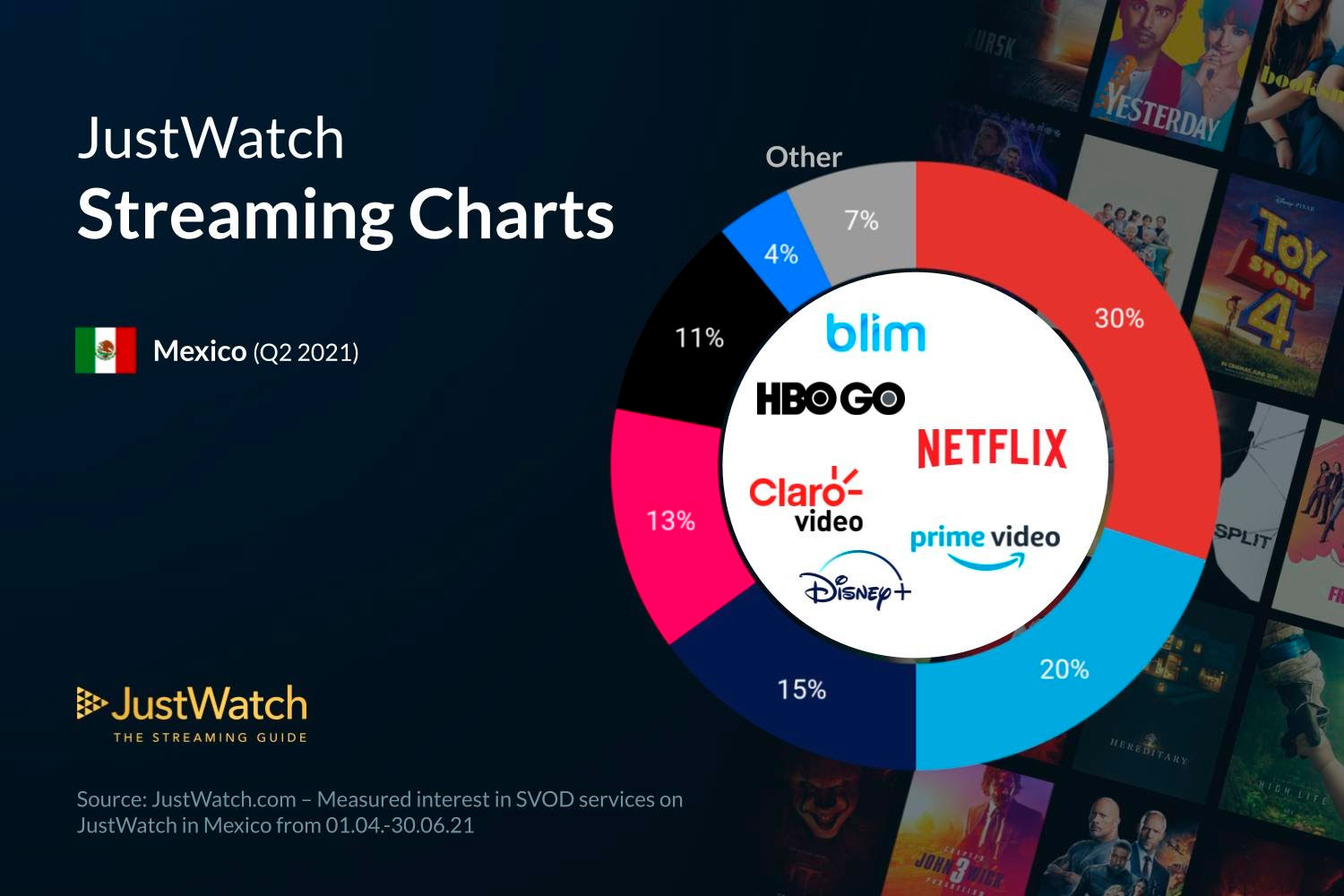 En esta ocasión, te queremos mostrar unos datos muy buenos que nos han compartido los amigos de JustWatch, en donde podemos apreciar el porcentaje de mercado que tiene los servicios de streaming más populares en México, como son Netflix, Prime Video, Disney +, Claro Video, HBO Go y Blim, para el segundo cuarto de este 2021
