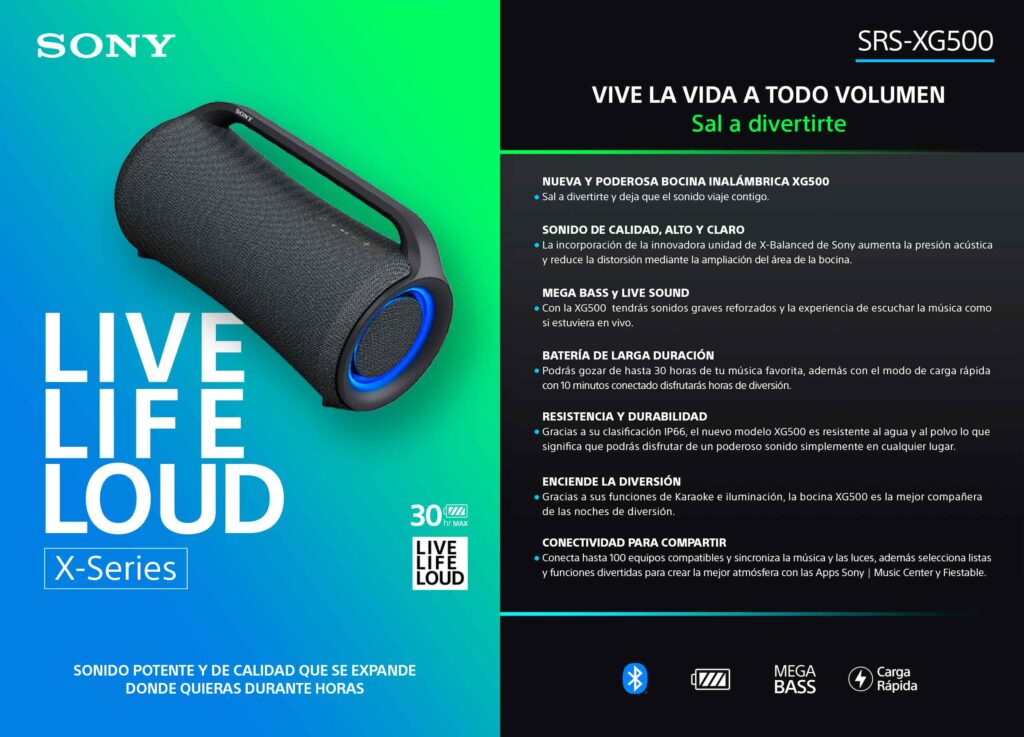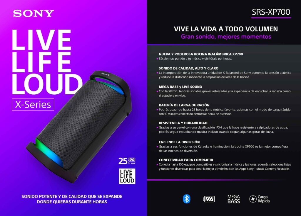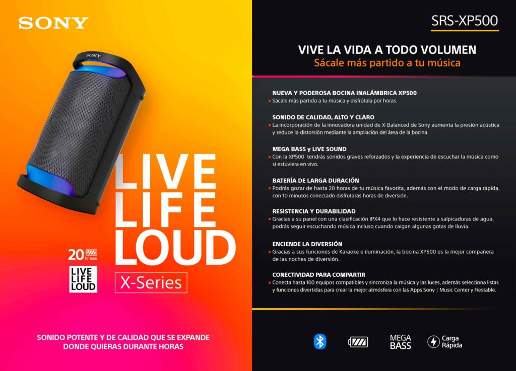 En esta ocasión «Sony« nos presenta 3 nuevas y poderosas bocinas inalámbricas «Serie X», diseñadas para compartir música por horas, con un sonido potente en dondequiera que te encuentres, ya sea en una habitación o en la playa.