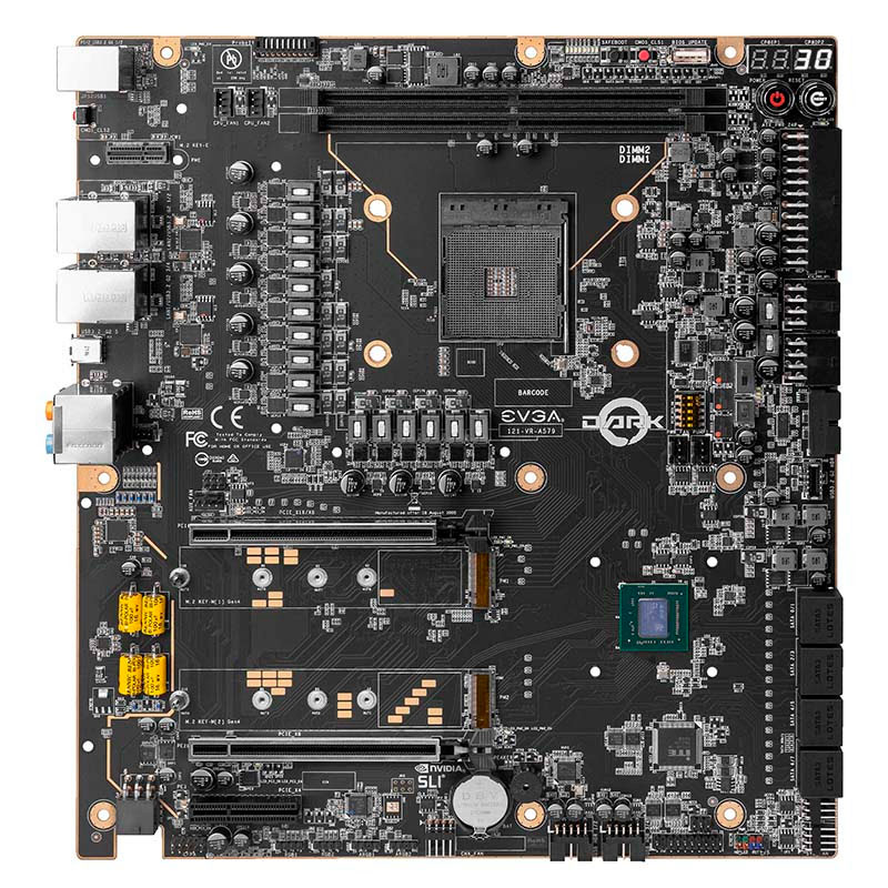 La EVGA X570 DARK sigue los pasos de los modelos anteriores de la línea DARK y cuenta con sus características tradicionales como un zócalo rotado a 90° para una mejor disposición del VRM, conectores de alimentación a 90° para mejor manejo de cables, y una gran cantidad de características para overclocking que incluyen múltiples indicadores POST, un conector ProbeIt para medición de voltaje en tiempo real, switches para deshabilitar puertos PCIe y para activar el modo lento, y doble BIOS para almacenar múltiples configuraciones y asegurar que el sistema funcione aún bajo las máximas exigencias.