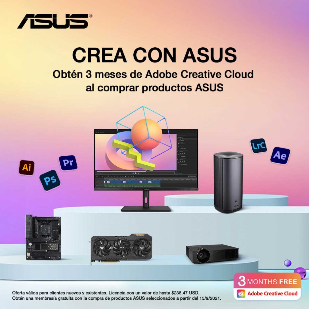 Entre los productos califican para una membresía de tres meses a Creative Cloud se encuentran los Motherboards Pro WS y ProArt, Monitores ProArt, Proyector PC ProArt A1, los portátiles Zenbook Pro y los portátiles Vivobook Pro.