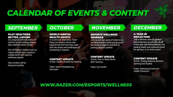 Con un enfoque en cuatro verticales clave: actividad física, salud mental, sueño y nutrición, Razer ha reunido a expertos en bienestar de los esports, atletas profesionales, líderes de opinión y equipos líderes de esports para apoyar este programa. Junto con la comunidad, Razer ha organizado múltiples charlas, eventos y activaciones para educar a los aspirantes a atletas y facilitarles el rigor del juego, que se proporcionarán en el sitio web. Los recursos incluirán: