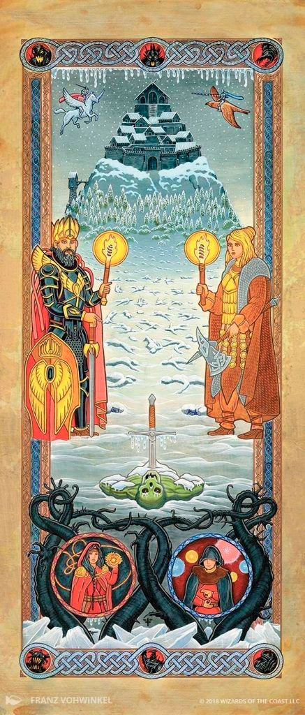2.- Time of Ice, por Franz Vohwinkel. Ya sea el paisaje nevado en la parte superior, los personajes en tonalidad dorada del medio o los retratos rodeados de espinas de abajo, en esta bellísima ilustración hay mucha tela para cortar.