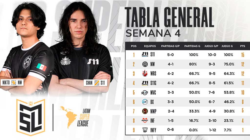 S11 Gaming Argentina le ganó el duelo directo por la punta del campeonato a S11 Gaming Bolivia y lidera invicto la clasificación con 15 puntos, tras culminar la cuarta semana de competencia de Mobile Legends Super League. A su vez, New Wave México y Warriors Team lo escoltan con 12 puntos. El próximo sábado 8 y domingo 9 de octubre se disputará la semana 5 a partir de las 16hs de Perú y se transmitirá a través de los canales oficiales de Mobile Legends: Bang Bang LATAM en Tik Tok, Facebook y YouTube.