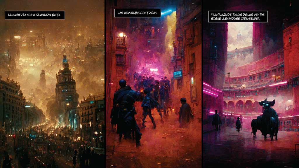 La agencia de publicidad española CYW con sede en Madrid ha desarrollado una novela gráfica que se desarrolla en un Madrid futurista en el año 2614. Todas las ilustraciones han sido cien por cien realizadas utilizando inteligencia artificial. Lleva por nombre GATAS, haciendo referencia a ‘gatos’, apelativo con el que se refiere a los madrileños y calificativo que se remonta a la etapa de la Edad Media.