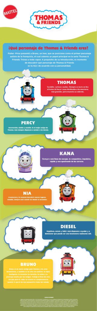 Fisher Price presentó a Bruno, un tren, que se posiciona como el primer personaje autista de la franquicia, el cual ostenta un papel principal en la serie Thomas & Friends: Trenes a todo vapor-. A propósito de su introducción, es momento de descubrir qué personaje de Thomas & Friends es tu hij@ de acuerdo con su personalidad.