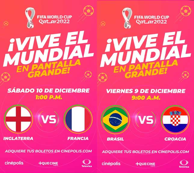 Ciudad de México, 08 de diciembre – Cinépolis +QUE CINE la ventana de contenido alternativo de Cinépolis, en alianza con TelevisaUnivisión, transmitirá en pantalla grande los cuartos de final de Qatar 2022. En esta fase, ocho países de América, Europa y África mostrarán su mejor futbol para dar un paso más hacia la copa del mundo.