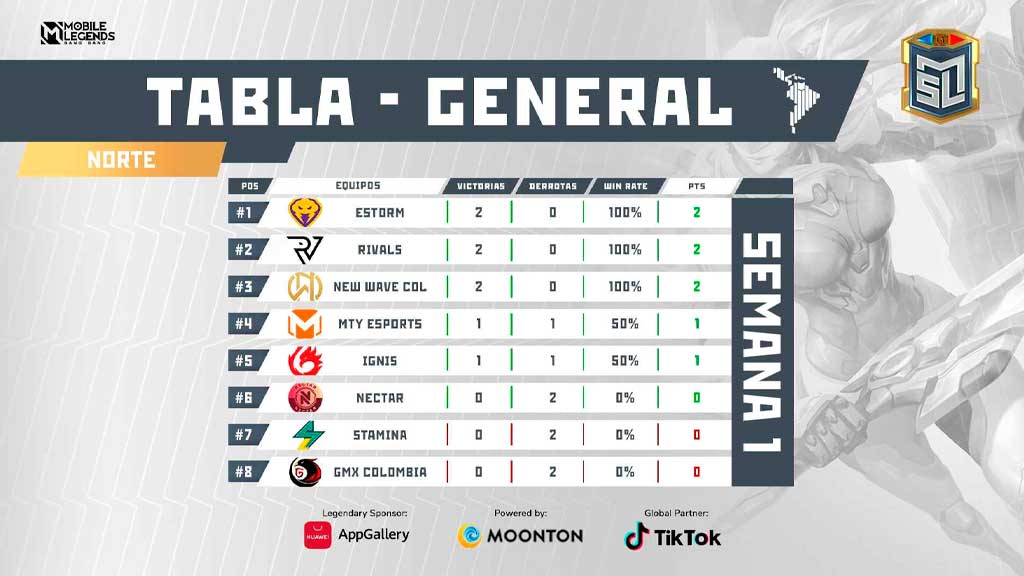 La primera edición de la Mobile Legends: Bang Bang LATAM Super League Norte y Sur inauguró el sábado pasado con grandes expectativas e interesantes propuestas de enfrentamientos. ESTORM y Nectar tuvieron el primer encuentro de la temporada, dándole inicio a la primera jornada de sábado. En el partido, ESTORM se llevó la victoria 2 a 0 y escaló a la cima de la tabla de posiciones. Seguidamente, IGNIS Esports y Monterrey Esports igualaron 1 a 1 en el segundo cruce del día. STMN Esports cayó derrotado 2-0 ante Rivals y la escuadra colombiana sumó dos puntos para comenzar con el pie derecho en la temporada regular. Por último, New Wave Colombia venció a GMX Colombia en un duelo de equipos colombianos y New Wave pudo llevarse la victoria ante sus compatriotas por 2 a 0.