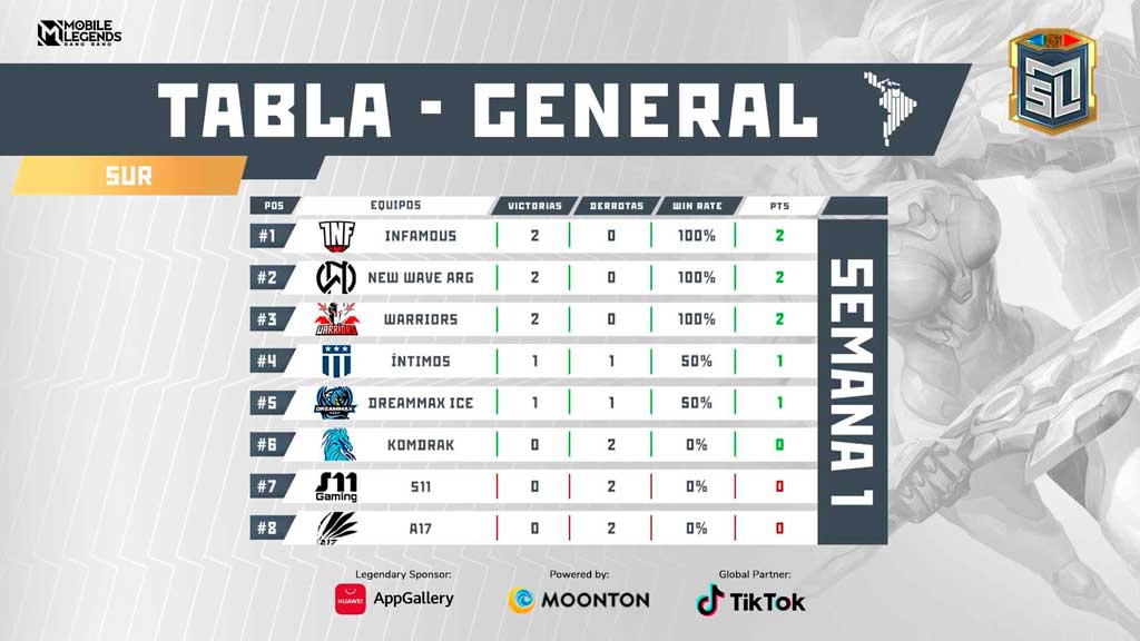 Latinoamérica, 10 de marzo de 2023.- El Torneo Apertura de Mobile Legends: Bang Bang LATAM Super League 2023 comenzó el pasado fin de semana. La jornada 1 de ambas regiones dejaron grandes resultados como los de Infamous Gaming, New Wave Argentina y Warriors Team que se posicionan a la cabeza en el sur. ESTORM, Rivals y New Wave Colombia ganaron sus partidos y se ubican como líderes en el norte. No te pierdas nada de la acción de Mobile Legends este fin de semana desde las 15hs México, 16hs de Perú/Colombia. Se transmitirá a través de los canales oficiales de Mobile Legends: Bang Bang LATAM en Tik Tok, Facebook y YouTube.