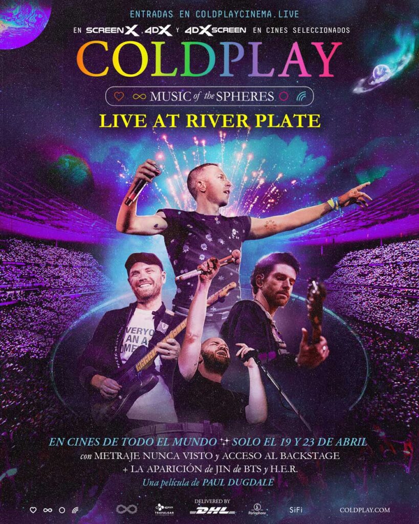 Desde el estadio River Plate de Buenos Aires y con sold out en todas las fechas, el concierto fue grabado durante las 10 presentaciones que realizó la banda en el país, con presentaciones especiales de artistas invitados como H.E.R y Jin de BTS. Con un sonido remasterizado e increíbles efectos visuales del director Paul Dugdale, ganador de un BAFTA y nominado a un Grammy, Coldplay hizo vibrar al país completo y de la mano con +QUE CINE podrás disfrutar de esta obra de arte en un formato 4DX, que reproduce la atmósfera simulando el concierto en vivo al combinar más de 20 efectos ambientales sincronizados con la música y escenas del show.
