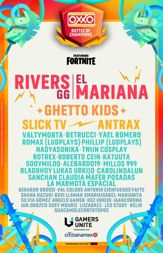 El Mariana, Rivers GG, Antrax, Slick TV y más talentos gamers, se encuentran más que listos para poder llevar sus habilidades en un juego de exhibición. También con el objetivo de brindar a los asistentes una experiencia inigualable, el OXXO Battle Of Champions contará con una amplia variedad de actividades que abarcan todos los aspectos del universo Fortnite. Los visitantes podrán disfrutar de la final de un torneo de e sports de alto nivel, donde los mejores jugadores del país competirán por la gloria y emocionantes premios.
