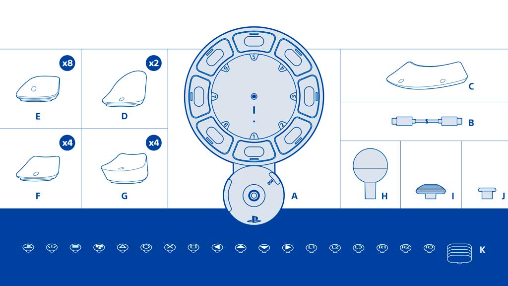 | (19) tapas de botones | (1) tapa de botón plana ancha – (cubre dos espacios de botón) (2) tapas de botón salientes – (ayudan a los jugadores con manos más pequeñas, ya que se ubican más cerca del centro) (4) tapas de botón curvas – (se pueden presionar si se colocan por la parte superior o tirar si se colocan por la parte inferior del control) (8) tapas de botones tipo almohada (4) tapas de botones planas |