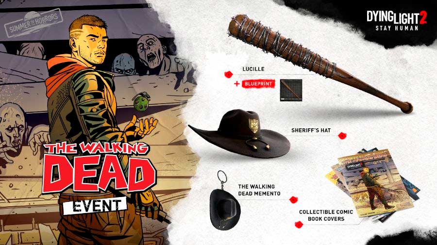 A los verdaderos fans les espera un regalo muy especial. Se trata de Lucille, ¡el infame bate con alambre de púas de Negan! Esta arma sólo la podrán conseguir los jugadores más despiadados. Para obtener el plano para este ítem se deberá completar el Objetivo Semanal, matando a 850 enemigos en total a lo largo del evento. ¡Pero eso no es todo; hay un premio más por conseguir! Si los jugadores de Dying Light 2 Stay Human demuestran ser realmente feroces y matan juntos a 160 millones de enemigos, ¡se cumplirá el Objetivo Global y todos obtendrán el Sombrero de Rick como recompensa!