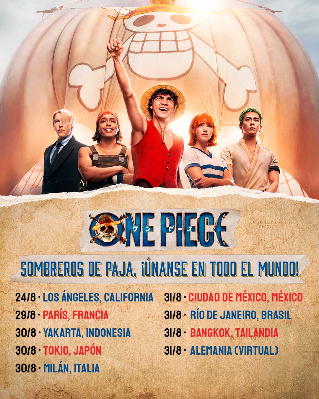 Hoy Netflix anunció la lista de celebraciones planeadas especialmente para los fans de ONE PIECE, en las que los Sombreros de Paja alrededor del mundo, podrán reunirse previo al estreno de la serie, este 31 de agosto.