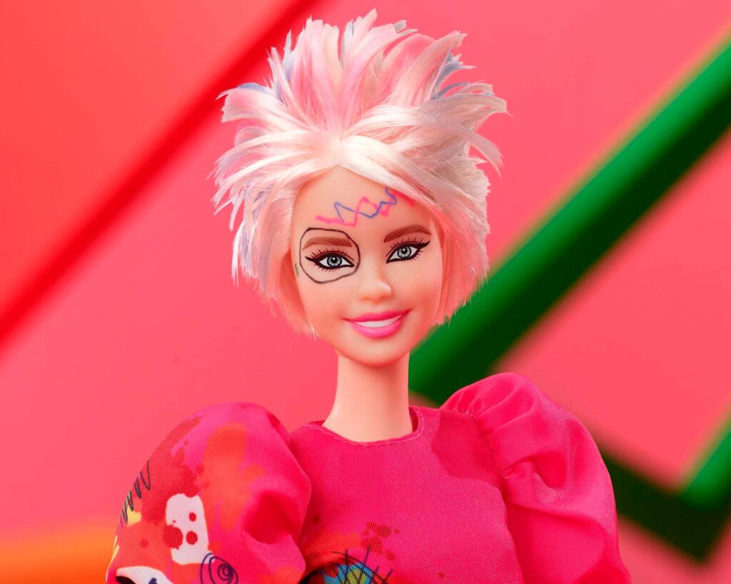 - Muñeca Barbie Rara: Lleva un vestido rosa brillante con ilustraciones de colores y mangas abultadas, botas verdes de piel de serpiente y pelo corto y despeinado para emular a una muñeca con la que se ha «jugado demasiado».