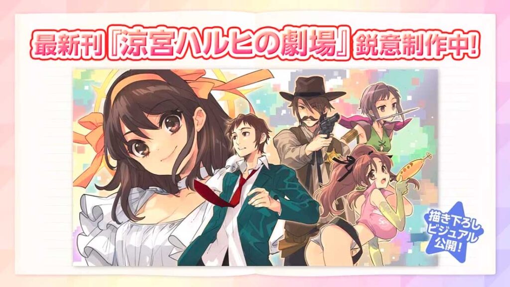 El especial «Sneaker Bunko 35th Anniversary Festa!» transmitido en vivo proporcionó más detalles sobre el nuevo volumen de la serie de novelas ligeras de Haruhi Suzumiya de Nagaru Tanigawa el domingo. El volumen incluirá dos historias cortas previamente publicadas en la revista The Sneaker de Kadokawa, además de una nueva secuela de esas dos historias.