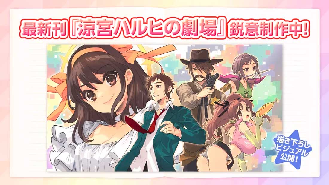 La ilustradora de la franquicia, Noizi Ito, dibujó la ilustración de arriba, insinuando los diferentes entornos de mundo que la Brigada SOS encuentra, para el anuncio del nuevo volumen. El evento en el escenario del domingo también anunció que el «legendario» evento de concierto de 2009 «Suzumiya Haruhi no Gensō» regresará después de 15 años con el elenco y el compositor Satoru Kousaki.