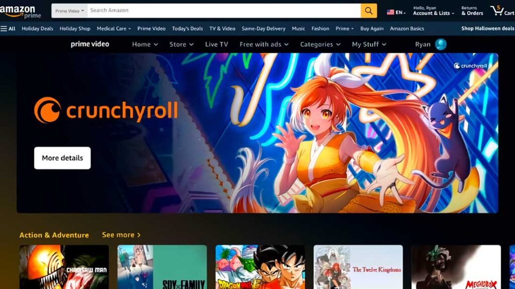 Crunchyroll ofrece sus niveles de suscripción Fan y Mega Fan a través de Prime Video. Este último incluye la visualización sin conexión además de transmisiones sin anuncios, con beneficios no relacionados con videos que se agregarán próximamente, según la compañía.
