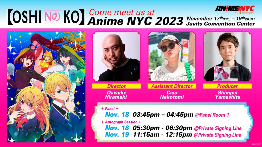 El personal estará en el panel de 【OSHI NO KO】 el sábado 18 de noviembre y en dos sesiones de autógrafos en AnimeNYC 2023 el sábado 18 y el domingo 19 de noviembre.