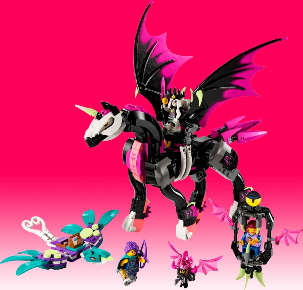 El Caballo Volador Pegaso cuenta con cabeza, ancas, cascos y cola articulados, permitiendo a los niños colocarlo en diversas posturas. Además, el trono del Rey Pesadilla y el pájaro de Zoey se pueden conectar a la criatura, añadiendo un toque mágico a esta cautivadora experiencia de construcción.