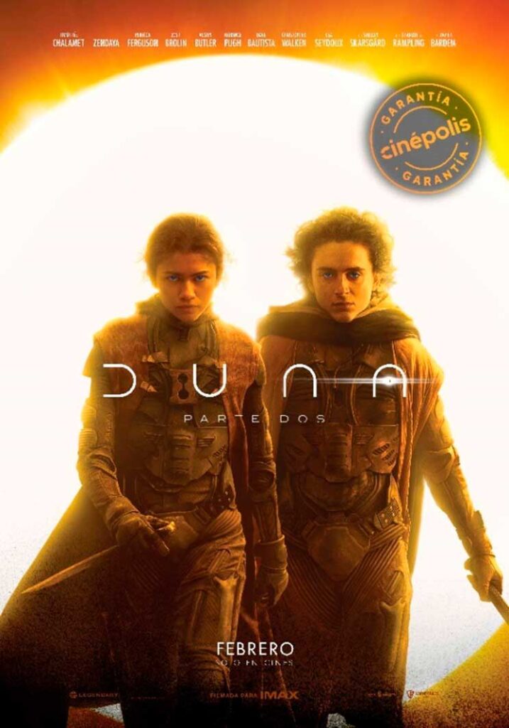 Duna: Parte Dos, llega con Garantía Cinépolis®️ a las salas de todo México, y en formato IMAX, 4DX y Screen X, el jueves 29 de febrero solo en cines. Compra tus boletos disponibles en www.cinepolis.com, en la App o en la taquilla, para ver en la pantalla más grande el espectáculo visual que ofrece.