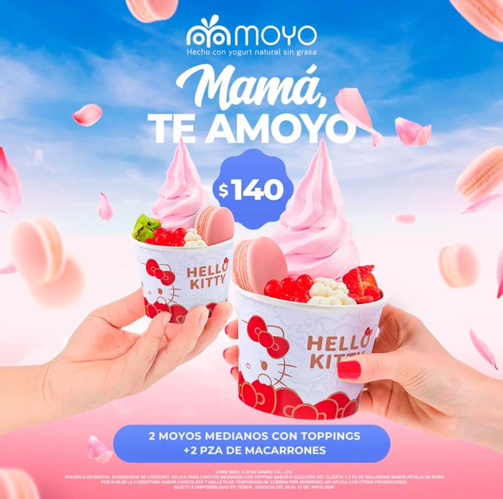 Ciudad de México, 08 de mayo de 2024.- A mamá le debemos el mundo. Ellas nos cuidaron mientras crecíamos, se emocionaron nuestras primeras sonrisas y también secaron las primeras lágrimas. Por ello, en el Día de las Madres, celebra con 2 macarrones de pétalos de rosa TOTALMENTE GRATIS incluidos en la promoción de 2 Moyos medianos con toppings por $140.