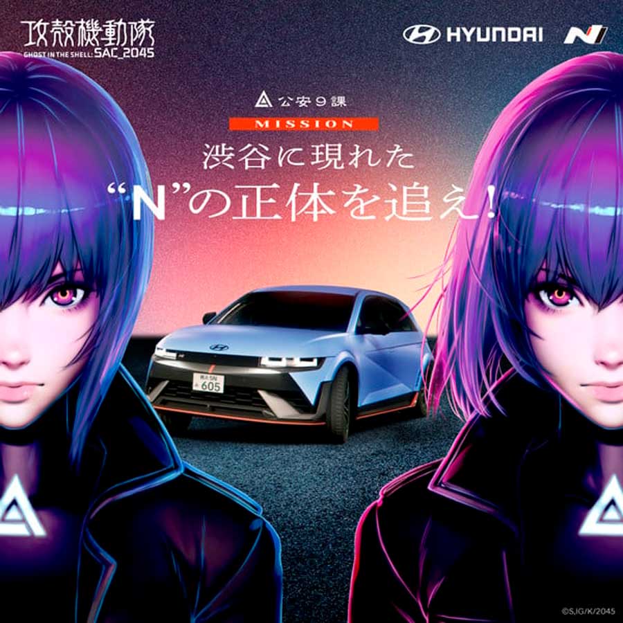 La tienda Shibuya Tsutaya albergará la colaboración entre Hyundai IONIQ 5 N y Ghost in the Shell del 3 al 22 de junio. Un modelo del espacio del evento en el sitio web de Ghost in the Shell muestra dos IONIQ 5 N en exhibición con un Tachikoma entre ellos. En el fondo, los videos se proyectarán en un bucle.
