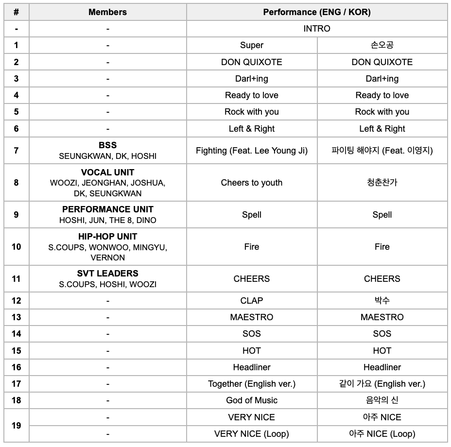 Luego, la actuación cambió a un ambiente más ameno con canciones como “Darl+ing”, “Ready to love” y “Rock with you”, que exudaban una vibra refrescante perfecta para la tarde de principios de otoño, mientras la multitud movía al ritmo de la música. Los fans también pudieron disfrutar del diverso espectro musical de SEVENTEEN a través de las presentaciones por unidad, incluyendo “Fighting (Feat. Lee Young Ji)” de BSS, “Cheers to youth” de la unidad vocal, “Spell” de la unidad de performance, “Fire” de la unidad de hip-hop y “CHEERS” de SVT LEADERS.