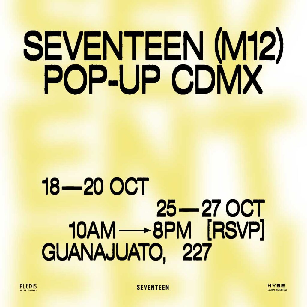 Los iconos del K-pop SEVENTEEN anuncian su primer tienda Pop-Up en Latinoamérica, que abrirá sus puertas en la Ciudad de México los fines de semana del 18 al 20 y del 25 al 27 de octubre en Guanajuato 227, Roma Norte. La noticia se dio a conocer anoche en las redes oficiales de HYBE Latinoamérica y Weverse.