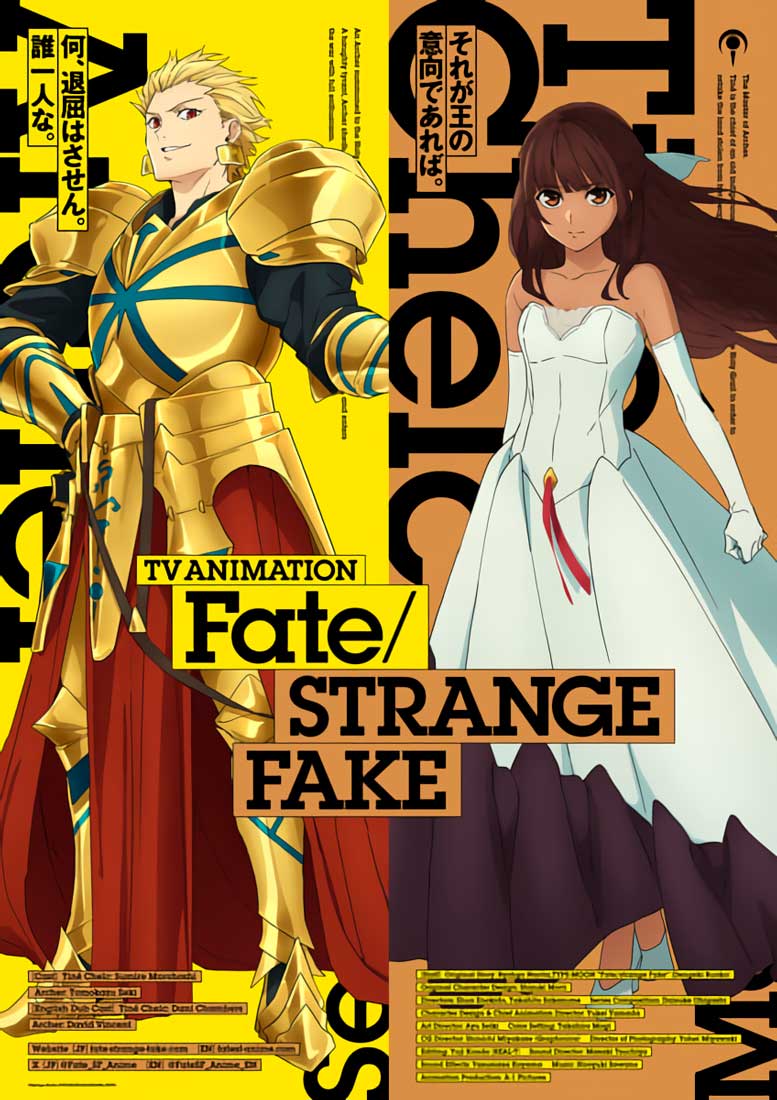 El elenco de Fate/strange Fake, que ya hizo su aparición en el especial de televisión Fate/strange Fake -Whispers of Dawn-, incluye a: