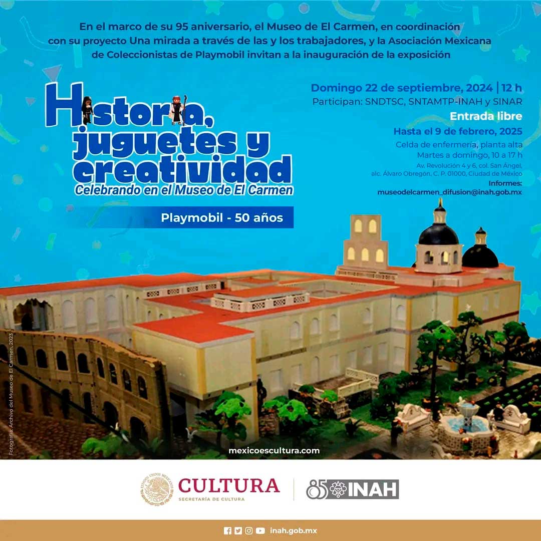 Para conmemorar el 95 aniversario del Museo de El Carmen, celebrar el 50 aniversario de Playmobil y los primeros diez años de Amexplay, Asociación Mexicana de Coleccionistas de Playmobil, A.C., este domingo 22 de septiembre se inaugurará la exposición Historia, juguetes y creatividad. Celebrando en el Museo de El Carmen. La cita es a las 12 del día en las instalaciones del recinto ubicado en Avenida Revolución 4 y 6, Colonia San Ángel, Ciudad de México.