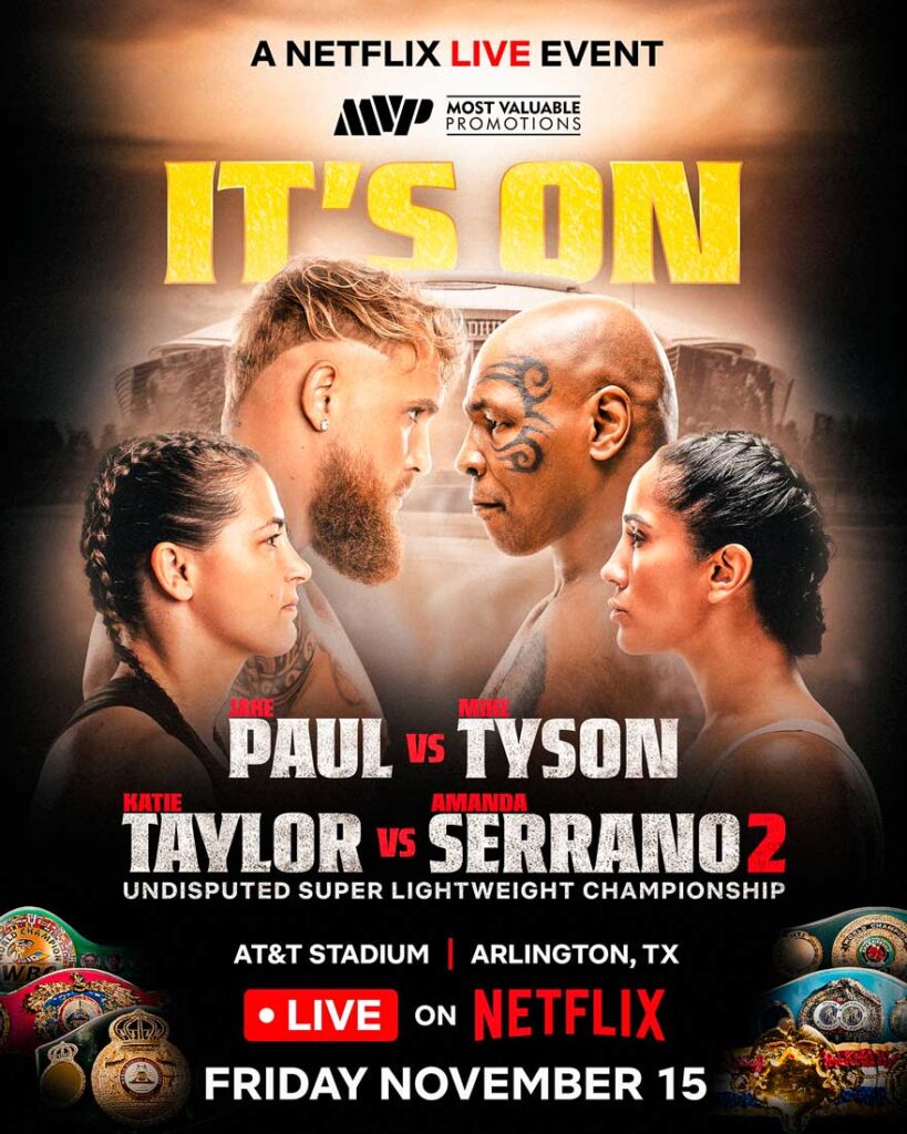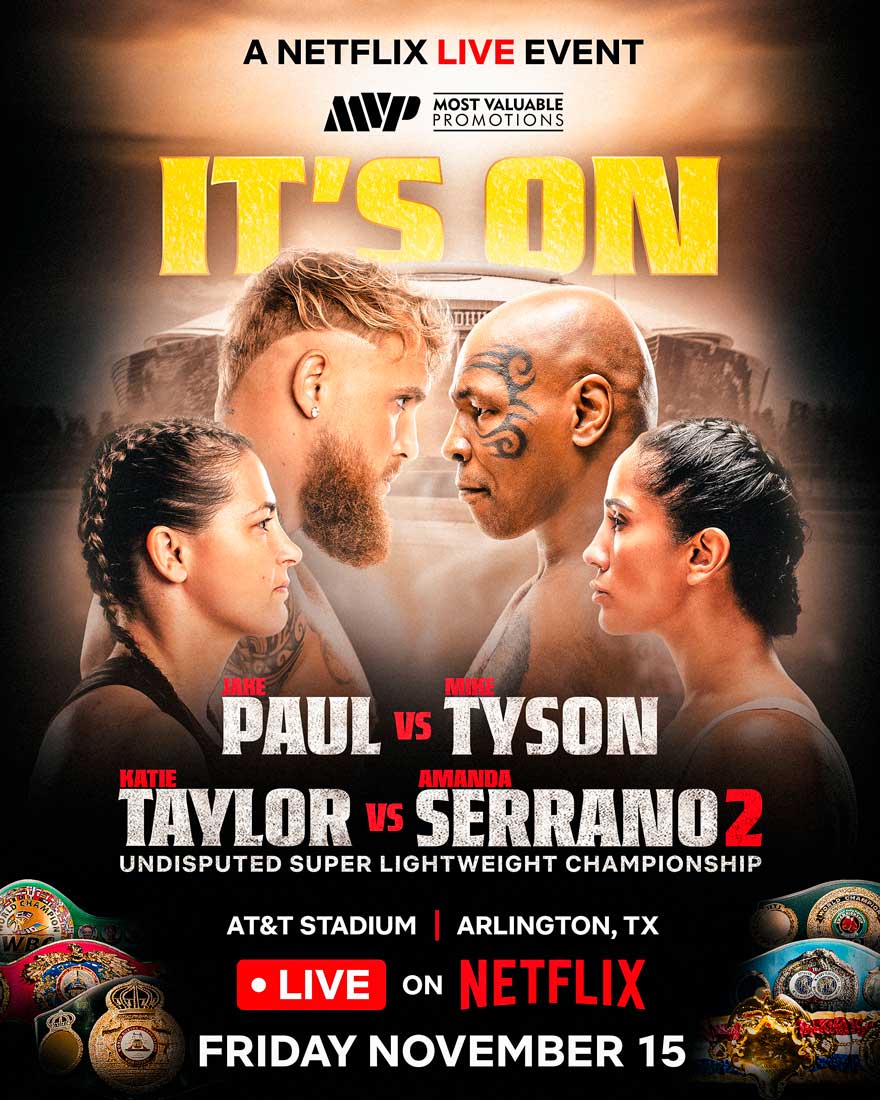 Netflix y Most Valuable Promotions (MVP) presentan un megaevento de boxeo de peso pesado encabezado por Jake Paul (10-1, 7 KOs) contra Mike Tyson (50-6, 44 KOs). Jake Paul vs. Mike Tyson se transmitirá en vivo a nivel mundial exclusivamente en Netflix el viernes 15 de noviembre de 2024 a las 6pm horario de Ciudad de México desde el AT&T Stadium, con capacidad para 80,000 espectadores, en Arlington, Texas, hogar de los Dallas Cowboys de la NFL. En el combate coestelar, la campeona mundial invicta de peso superligero de Matchroom, Katie Taylor (23-1, 6 KO), defenderá su título indiscutido en 10 asaltos de dos minutos contra la pionera del boxeo y campeona mundial unificada de peso pluma, Amanda Serrano (47-2-1, 31 KO), en la revancha más esperada de la historia del boxeo femenino.
