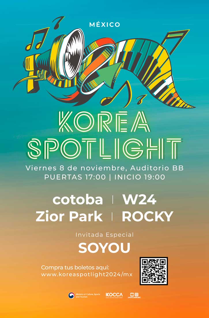 Con el propósito de fortalecer el vínculo entre México y Corea, el próximo 8 de noviembre la Agencia de Contenidos Creativos de Corea (KOCCA) llevará a cabo la segunda edición de Korea Spotlight, un showcase enfocado en presentar a la nueva generación de talento coreano que contará con la presencia de los artistas cotoba, W24, Zior Park, ROCKY y la invitada especial SOYOU. El evento estará abierto a todas las edades y se llevará a cabo en el Auditorio BB de 19:00-22:30, los boletos ya están disponibles a través de Passline. Las ventas están limitadas a un boleto por persona.