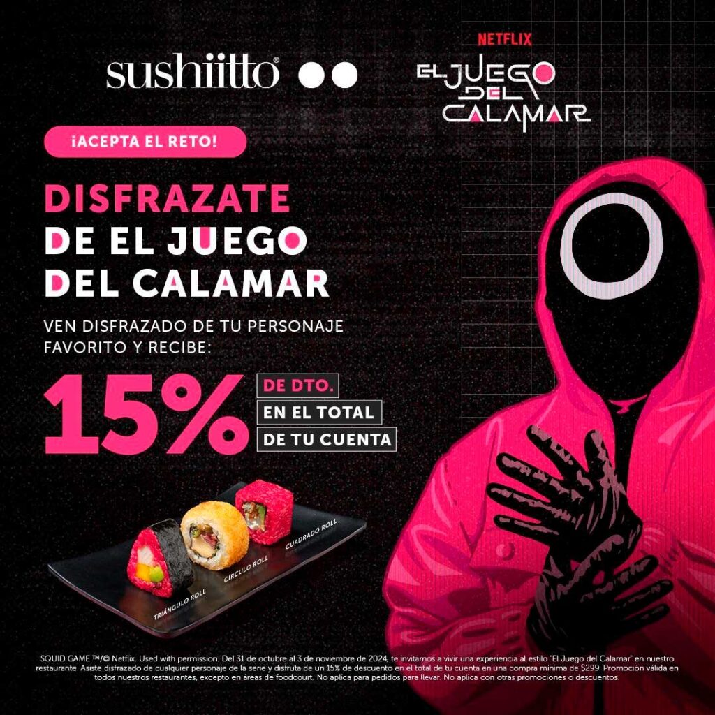 Ciudad de México a 29 de octubre de 2024 – ¿Están listos para una celebración inolvidable? Este Halloween y Día de Muertos, Sushiitto® “recluta” a sus comensales y los invita a sumergirse en la emoción de “El juego del calamar” con una experiencia culinaria inmersiva. Desde el 31 de octubre hasta el 3 de noviembre, si para su visita se disfrazan de cualquier personaje de la famosa serie, obtienen un 15% de descuento en el total de la cuenta, con un consumo mínimo de $299 pesos del exclusivo menú temático.