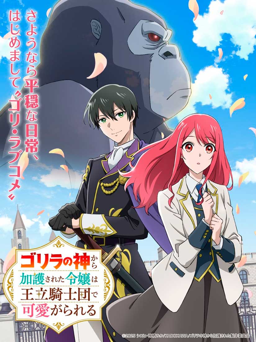 Kadokawa ha revelado un teaser promocional para la adaptación al anime de la serie de novelas Gorilla no Kami Kara Kago Sareta Reijō wa Ōritsu Kishidan de Kawaigareru (The Lady Blessed by the Gorilla God Is Adored by the Royal Knights), escrita por Shirohi y adaptada a manga por Mika Kamisu. El anime se estrenará en abril de 2025.