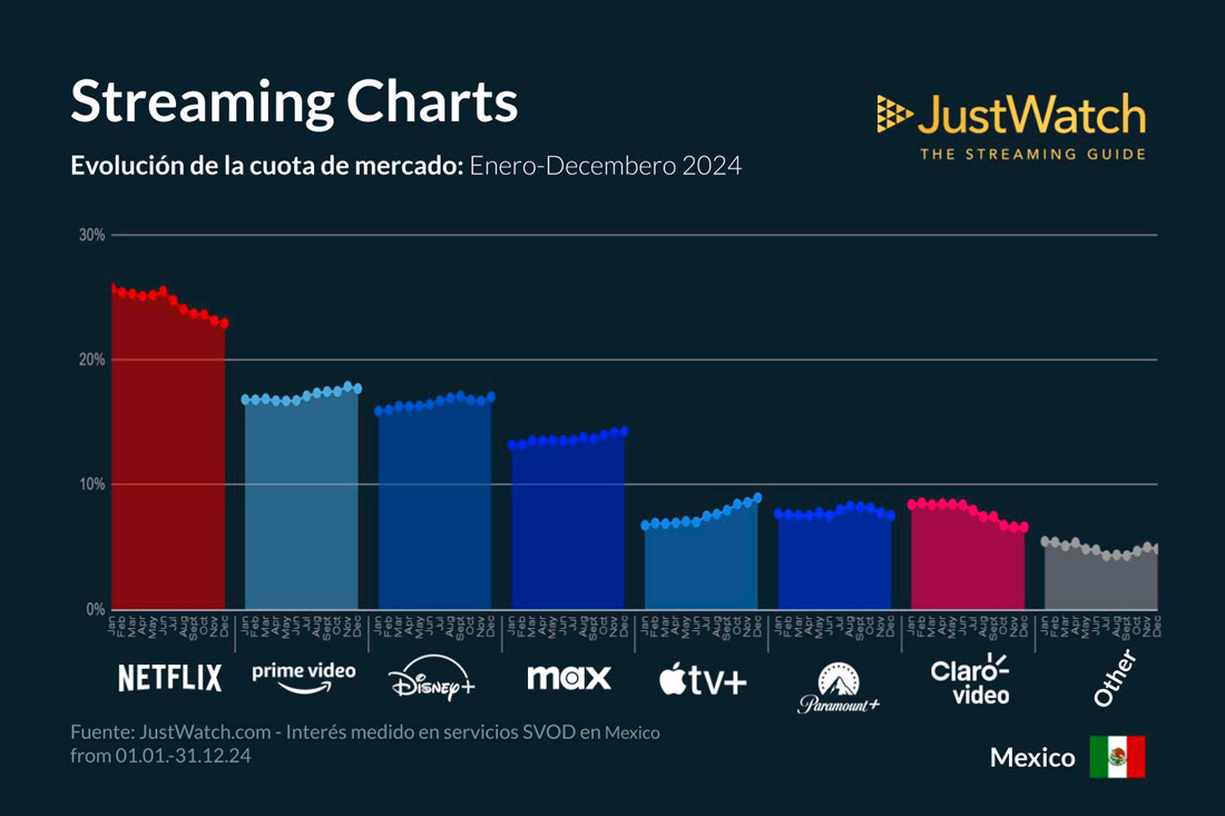 Netflix lidera el streaming en México en 2024, pero pierde cuota de mercado ante el crecimiento de Apple TV+ y otros servicios | #Streaming #Netflix #JustWatch