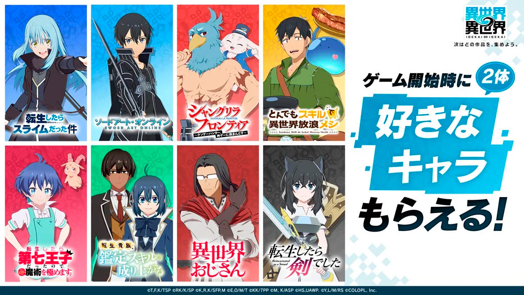 - Personajes gratuitos: Los jugadores pueden elegir dos personajes protagonistas de entre ocho series distintas, incluyendo a Rimuru (Tensei Shitara Slime Datta Ken), Kirito (Sword Art Online), y el peculiar tío de Isekai Ojisan.