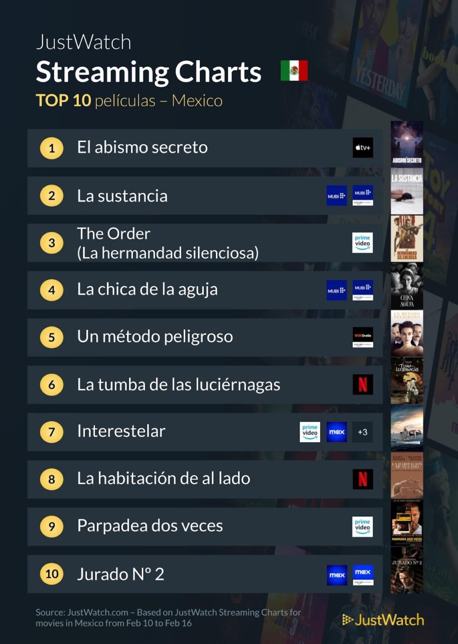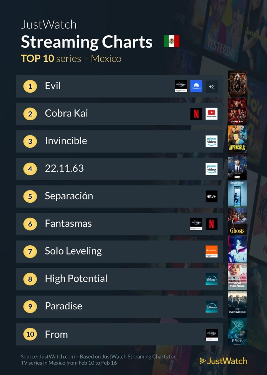JustWatch ha revelado el listado de las series y películas más vistas en streaming en México del 10 al 16 de febrero, con Evil y El abismo secreto liderando sus respectivas categorías.