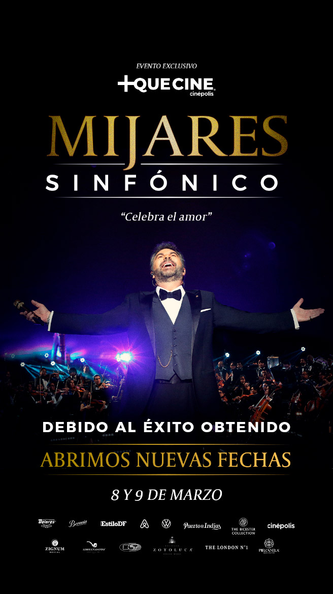 - Cinépolis +QUE CINE presenta fechas extendidas del concierto sinfónico de Mijares: Celebra el amor, en exclusiva el 8 y 9 de marzo.
