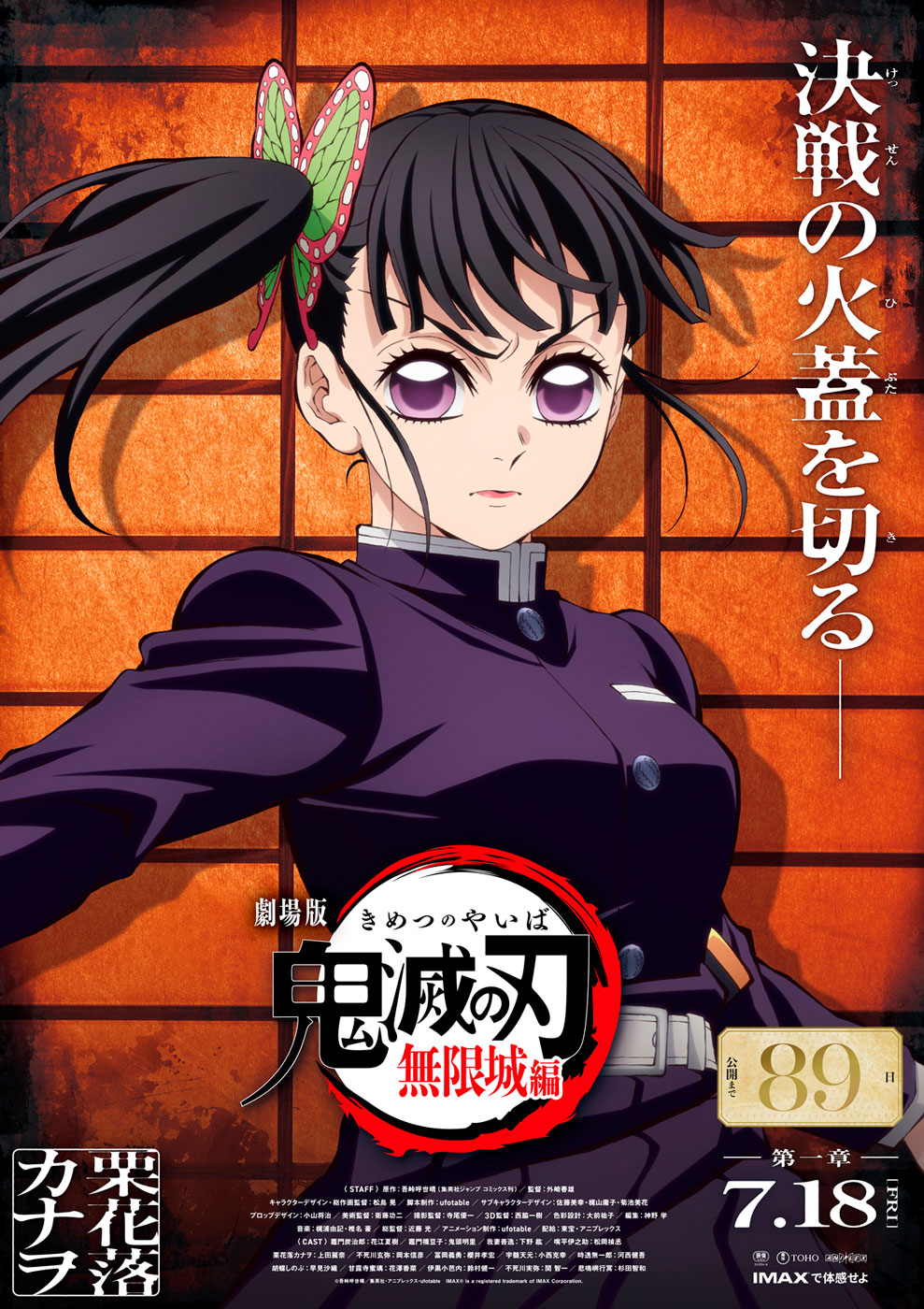 Este arte forma parte de una serie de pósters con cuenta regresiva que ha incluido ya a personajes clave como Tanjiro Kamado (97 días), Zenitsu Agatsuma (96 días) e Inosuke Hashibira (90 días). Ahora, es el turno de Kanao, cuyo retrato se presenta frente a un fondo cargado con la estética tétrica y majestuosa del Castillo Infinito.