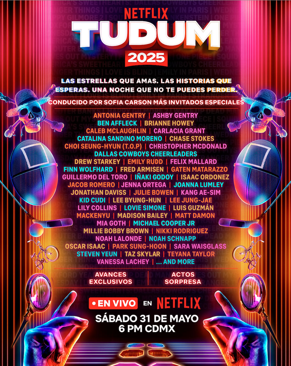 Este año, TUDUM regresa el 31 de mayo con una transmisión EN VIVO a las 6 PM MEX desde el Kia Forum de Los Ángeles. Este impresionante evento reunirá a las más grandes estrellas de Netflix, así como espectáculos deslumbrantes, primicias sorprendentes y momentos inolvidables.