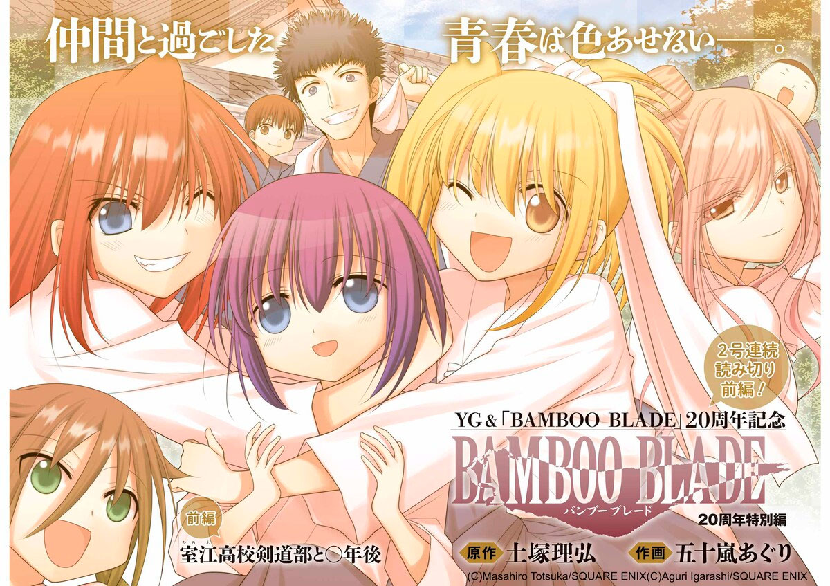 Bamboo Blade, la icónica serie de manga escrita por Masahiro Totsuka e ilustrada por Aguri Igarashi, celebra sus dos décadas de existencia con un one-shot especial conmemorativo que se divide en dos partes. La primera parte titulada “Muroe Kōkō Kendō-bu to ○-nen Ato” (El Club de Kendo de la Preparatoria Muroe y __ años después) fue publicada en la edición 12 de este año de la revista Young Gangan de Square Enix el pasado 6 de junio.