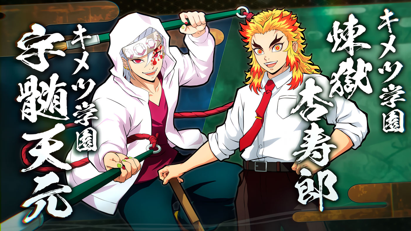 En esta versión, Kyojuro Rengoku se convierte en un apasionado profesor de historia que enseña con la misma energía ardiente que lo caracteriza como Pilar de la Llama, mientras que Tengen Uzui es un glamuroso maestro de artes que no pierde oportunidad para brillar y presumir su «estilo llamativo». Ambos personajes han sido vistos anteriormente usando un Ataque Dual Definitivo, lo cual apunta a una jugabilidad cooperativa y explosiva dentro del juego.